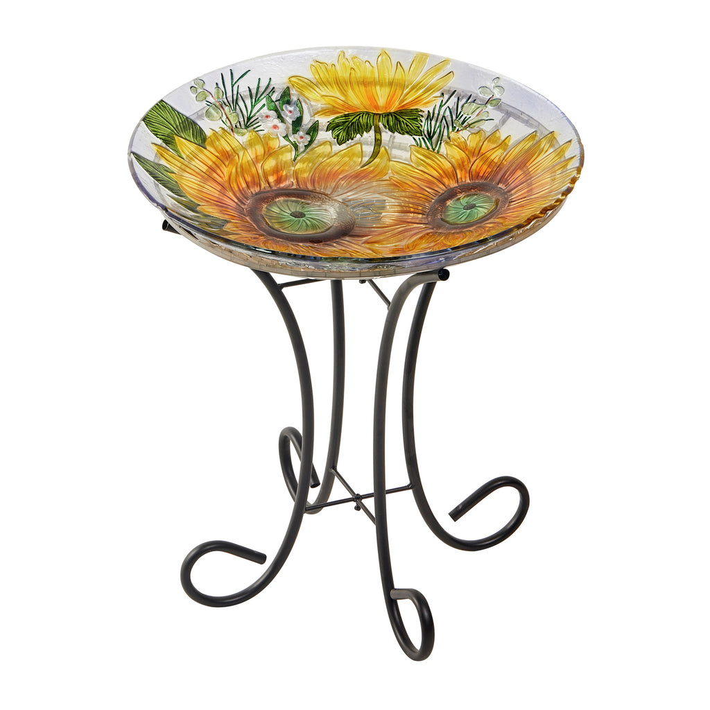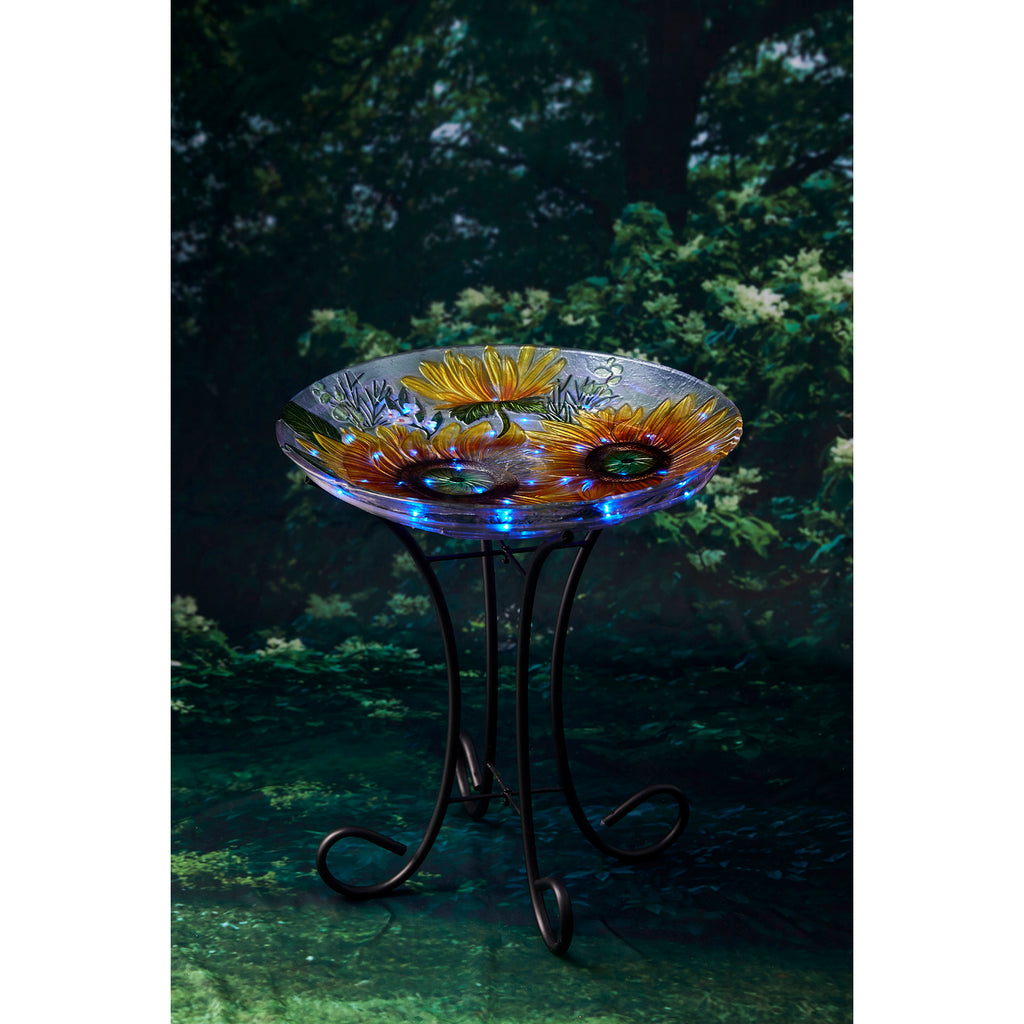 18" Solar Hand Painted Embossed Glass Bird Bath with Stand, Harvest Sunflowers,2sp6286