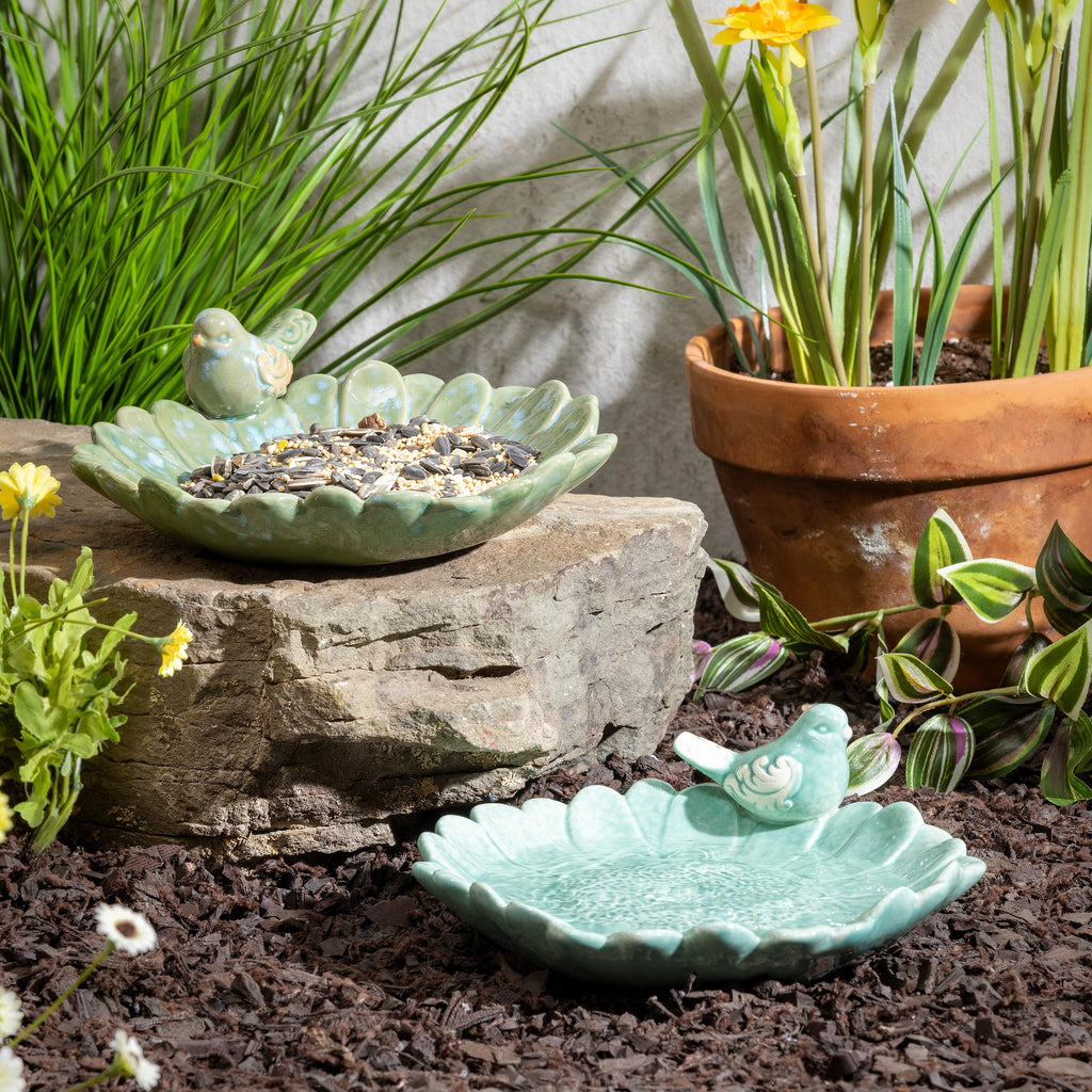 Enhance your garden with this charming ceramic bird feeder featuring a teal and green floral design complete with perched bird accents.