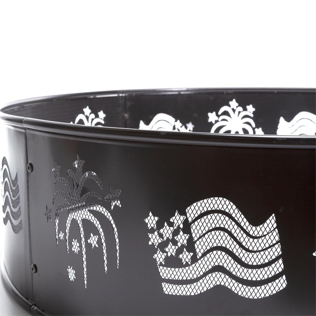 Enhance your outdoor space with the Flags and Fireworks Fire Ring, perfect for summer gatherings and patriotic celebrations. This 36-inch fire ring features an intricate design of flags and fireworks cutouts, creating a captivating display of flickering light. Made from durable steel with a high-temperature black finish, it offers both style and longevity. Ideal for backyard bonfires or camping trips, this fire ring adds warmth and ambiance to any setting. Easy to assemble and portable, it's a great addition to any outdoor decor.