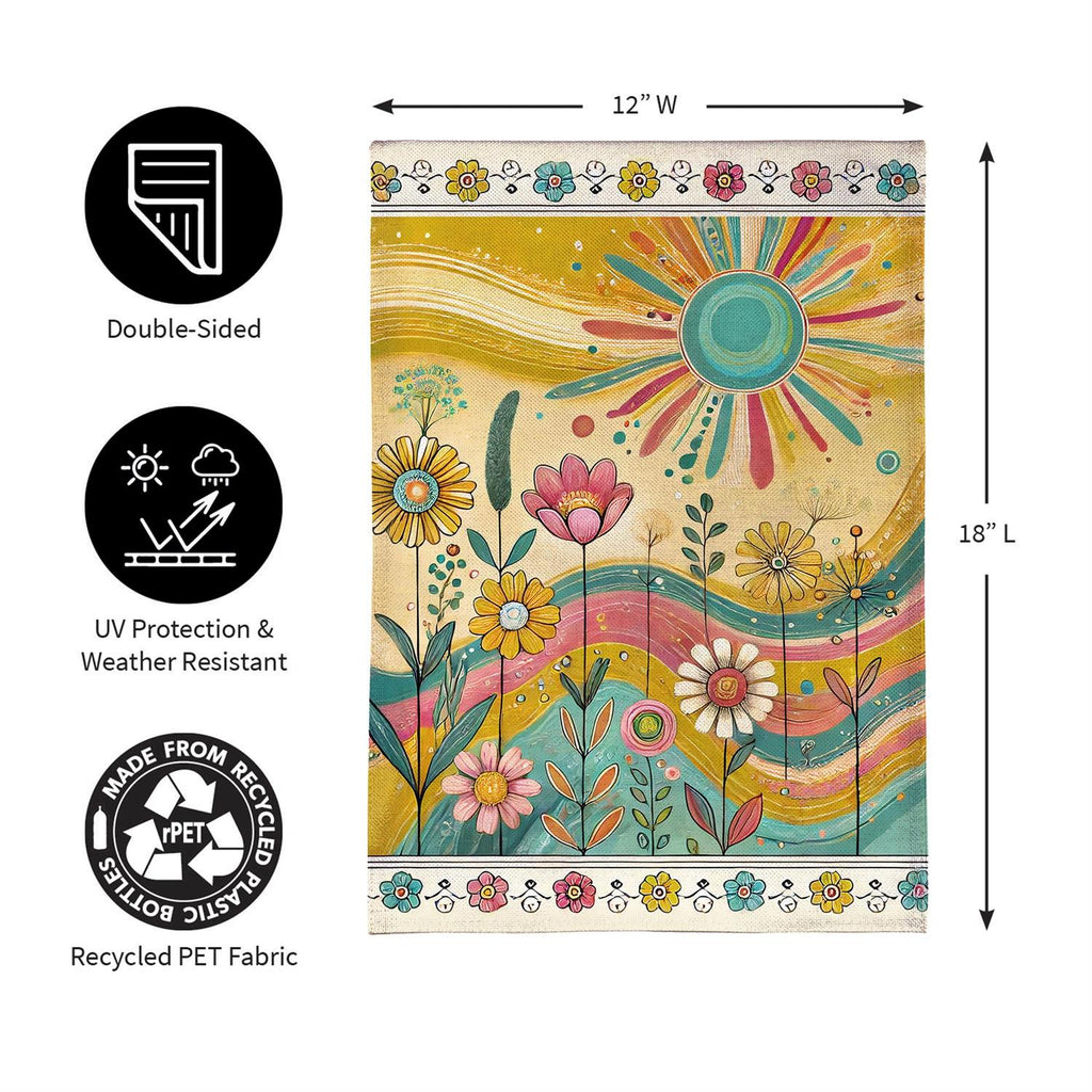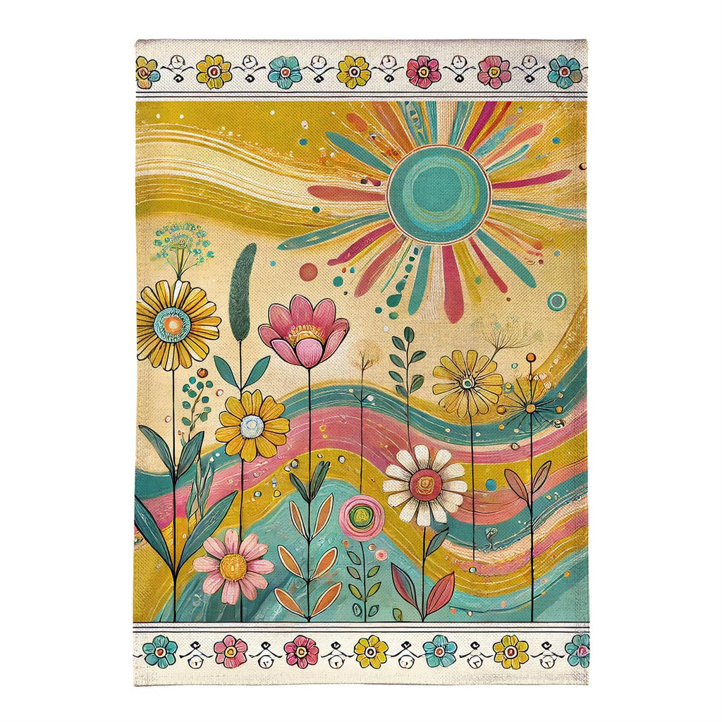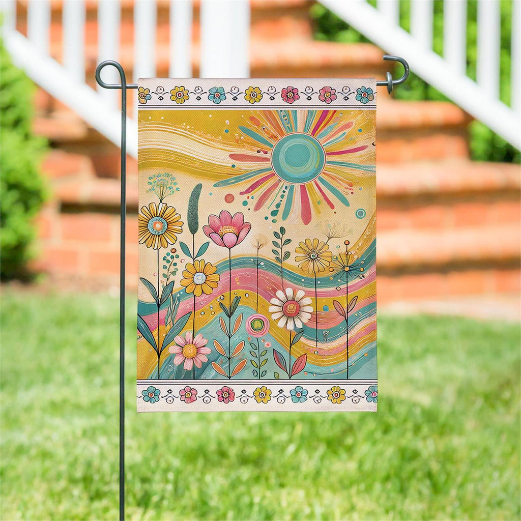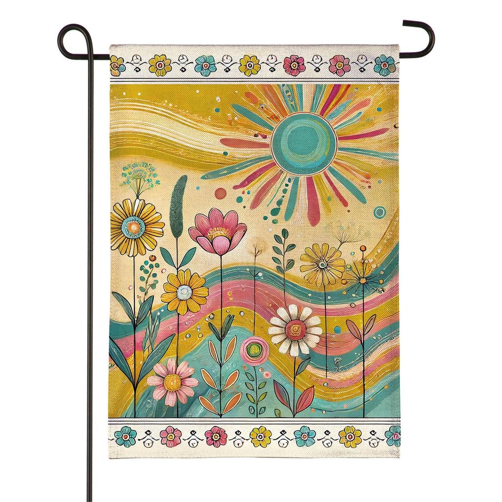 Add a burst of color and charm to your outdoor space with the Sunny Field Burlap Garden Flag. This vibrant flag features a cheerful design with colorful flowers and a radiant sun, perfect for welcoming spring and summer. Made from durable burlap, it withstands the elements while maintaining its bright, eye-catching appeal. Measuring 18 by 12.5 inches, it fits standard garden flag poles, making it an easy and stylish addition to your garden or porch. Enhance your home's curb appeal with this delightful decorative piece.