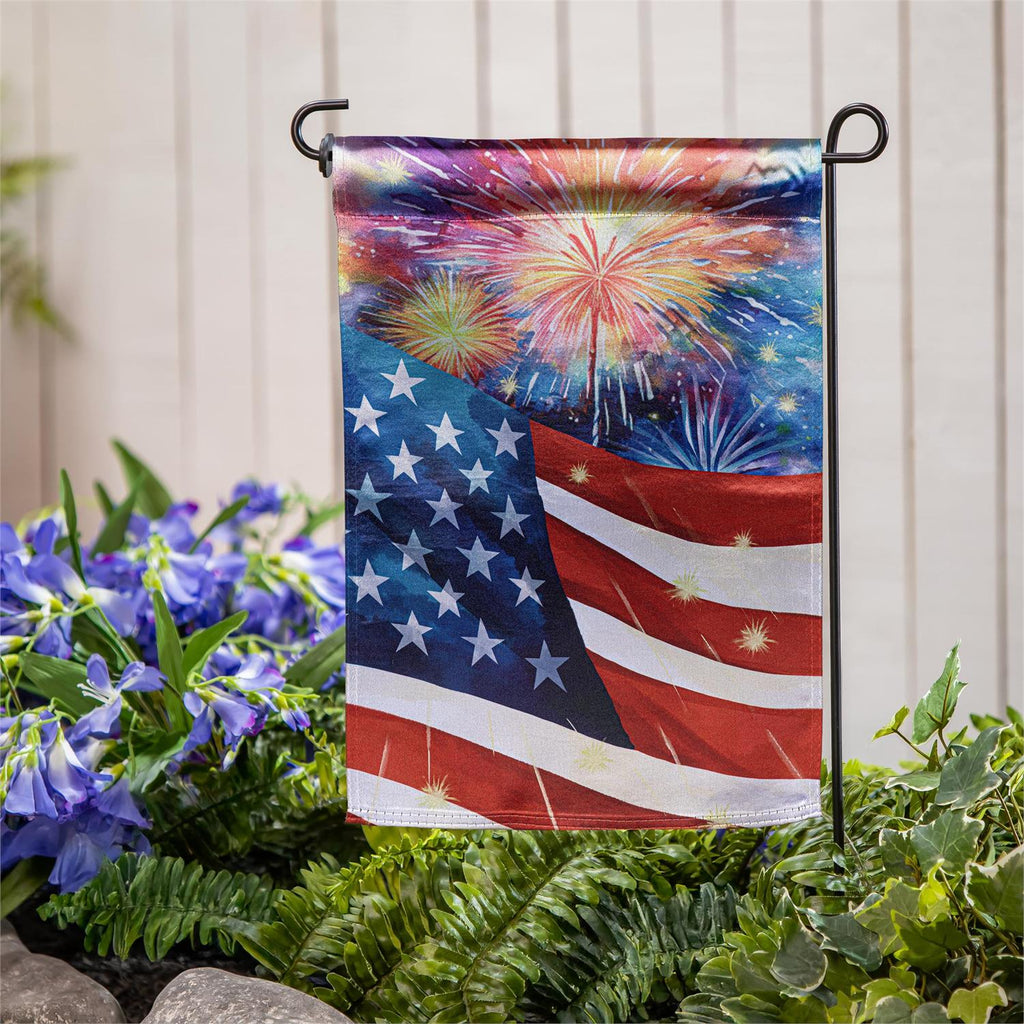 Celebrate patriotic spirit with the American Classic Fireworks Lustre Garden Flag. This vibrant flag features the iconic stars and stripes paired with a dazzling fireworks display, making it the perfect addition to your outdoor décor. Crafted for durability, it withstands seasonal elements while maintaining its stunning colors. Measuring 18.0 inches in length and 12.5 inches in width, this flag is ideal for gardens, patios, or any outdoor setting. Enhance your home's curb appeal during holidays or events with this eye-catching flag.