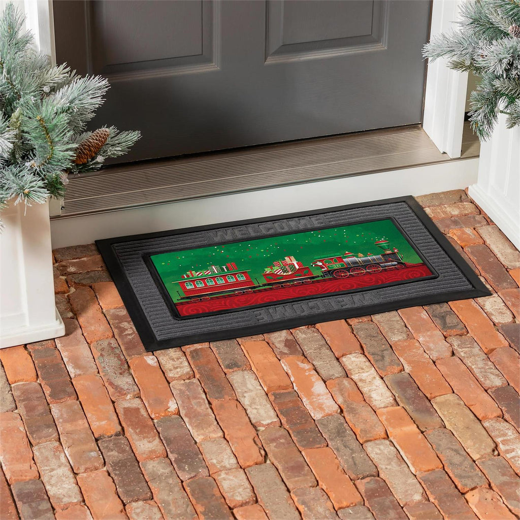 Welcome the festive season with the North Pole Express Sassafras Switch Mat. This vibrant insert features a jolly holiday train adorned with gifts, set against a rich green background. Measuring 22 inches in width and 10 inches in height, it fits perfectly with standard Sassafras mat frames. The weather-resistant material ensures durability for both indoor and outdoor use, making it a versatile addition to your holiday décor. With its intricate design and seasonal charm, this mat is perfect for greeting guests with a touch of Christmas cheer.