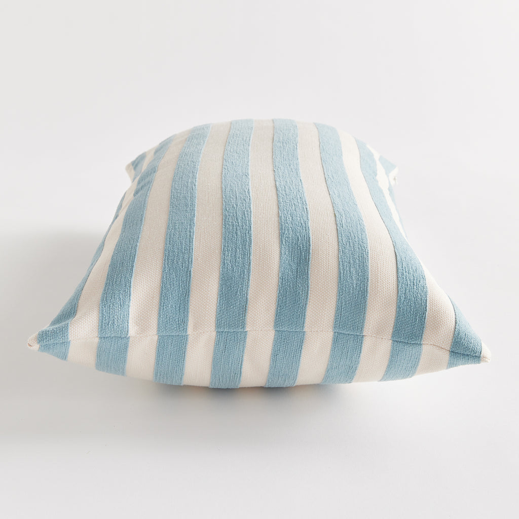 The indoor pillow that lives beautifully outdoors. Enjoy the upscale luxury and durability of Jacquard. With a graphic blue and cream striped pattern, it adds a pop of color to the sofa. This pillow is weather resistant and responsibly made. Filled with 100% recycled fibers.