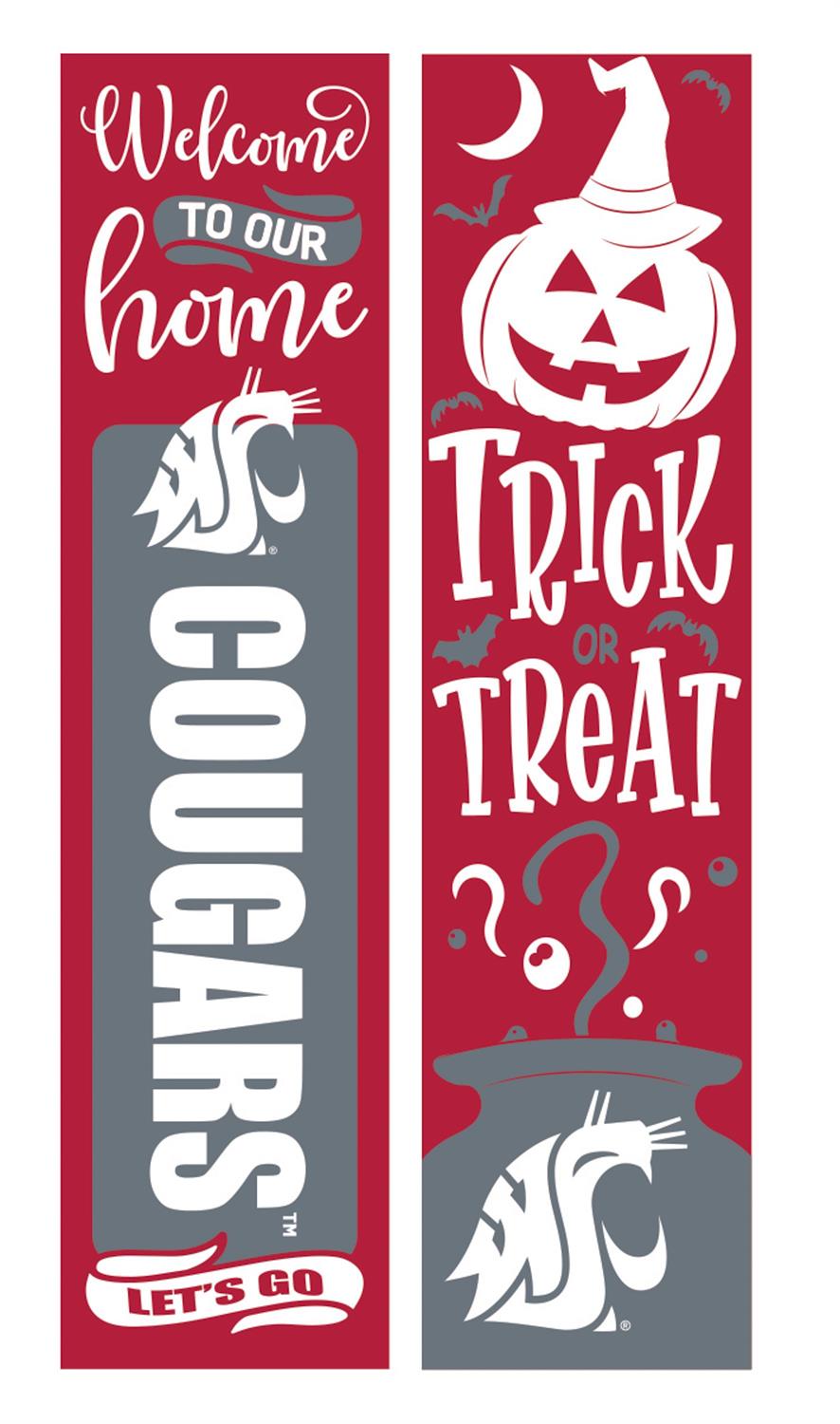 Celebrate Halloween with school spirit using this 46-inch double-sided porch leaner featuring Washington State University. Perfect for your entryway, this leaner showcases a festive "Trick or Treat" design on one side, complete with a whimsical jack-o'-lantern, while the reverse side proudly displays a spirited message for year-round decor. Crafted for durability, it fits seamlessly in any outdoor or indoor setting, adding a touch of seasonal charm and school pride. Its slim profile ensures it complements your space without overwhelming it, making it an ideal choice for both small and large porches.