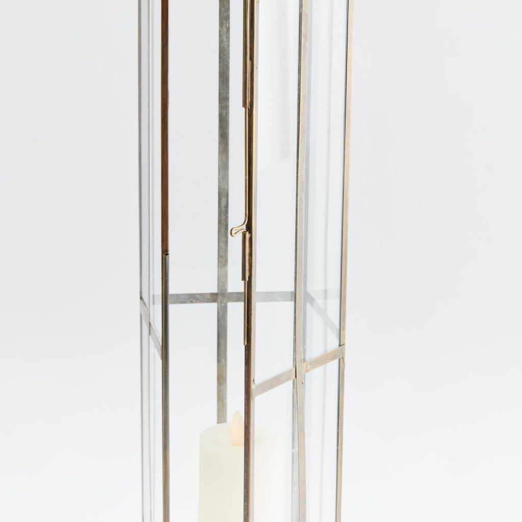 These elegant lanterns feature a timeless antique brass finish, offering a sophisticated touch to any interior space. Crafted from high-quality glass and iron, they are designed to impress with their unique silhouettes and modern designs. Each piece is thoughtfully constructed with bottom feet lined with felt to protect surfaces, while the warm brass finish beautifully complements the flickering of candlelight to create a magical ambiance.